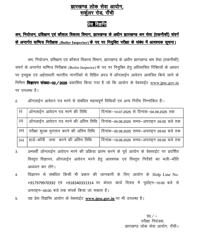 Important Updates and Notifications related to JPSC Boiler Inspector Recruitment 2025: